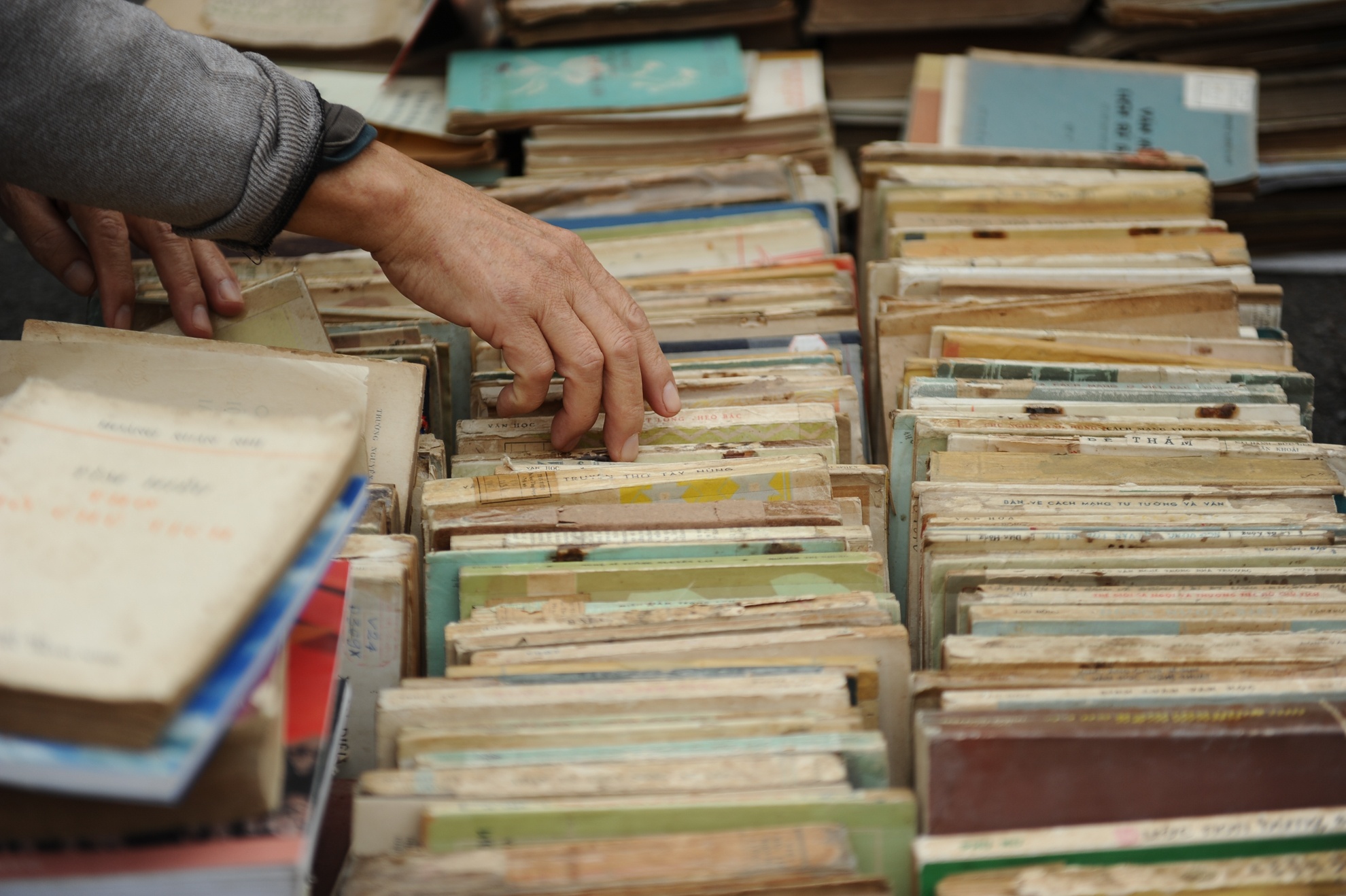 Một khách hàng lớn tuổi đang lần giở những cuốn sách nhuốm màu thời gian.
