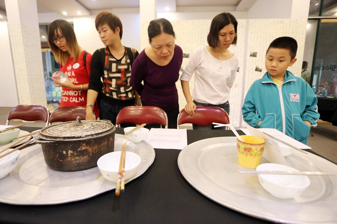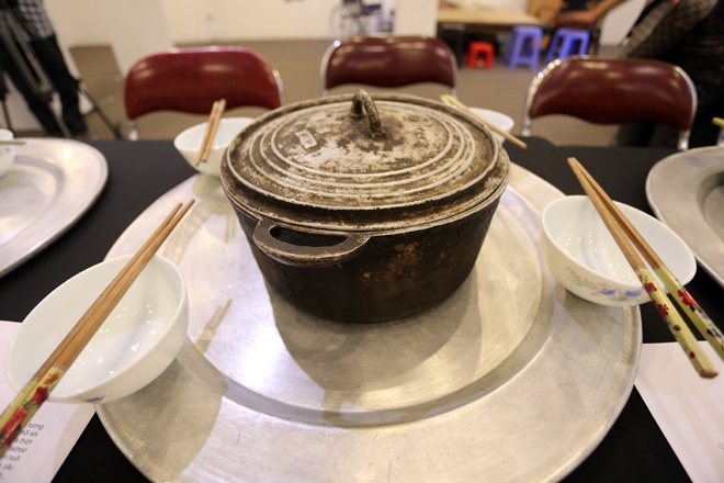 "Chiếc nồi này là một phần của gia đình tôi, nó còn lớn hơn tuổi của tôi nữa . Nhìn những thứ đồ cũ trong nhà tôi luôn nhớ đến những năm tháng bố mẹ nuôi lợn, buôn thủy tinh, bán văn phòng phầm, bên cạnh công việc hành chính nhà nước để nuôi hai chị em tôi khôn lớn. Rồi tôi lại tự dặn mình cố gắng để sau này báo hiếu cha mẹ", kỷ vật của một thành viên được trưng bày tại triển lãm.