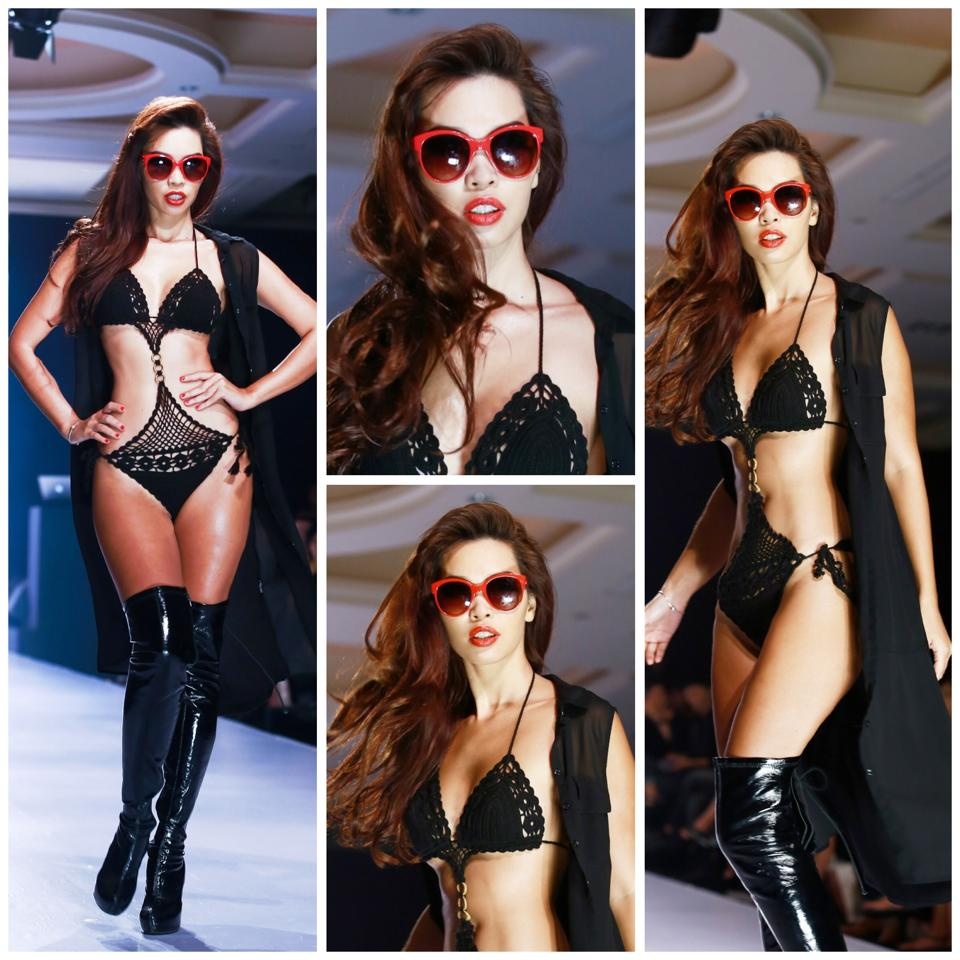 | Sau bộ cánh sexy bị phạt tại sàn diễn thời trang tháng 6, nữ người mẫu tiếp tục trình diễn mẫu áo tắm len mỏng tang khiêu gợi. Thiết kế nhỏ phô diễn toàn bộ da thịt người mặc khiến cô nhận lại không ít những bình phẩm chê bai về thân hình có đôi chân quá chuẩn người mẫu catwalk. |