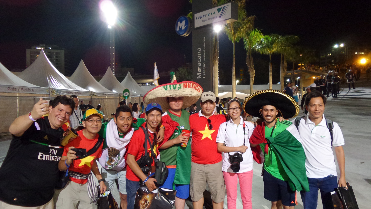 | Đoàn 5 nhiếp ảnh gia đến từ Việt Nam chụp ảnh lưu niệm cùng các CĐV Mexico. Sau trận Pháp - Ecuador, một thành viên trong nhóm rất muốn xem trận Hàn Quốc và Bỉ tại Sao Paolo, với ý nghĩ là trận đấu không có đội Nam Mỹ nào thì sẽ dễ mua vé. Tuy nhiên khi ra sân, giá vé hạng thường với chỗ ngồi trên cao cũng được cò vé chào với giá 1.000 USD. |