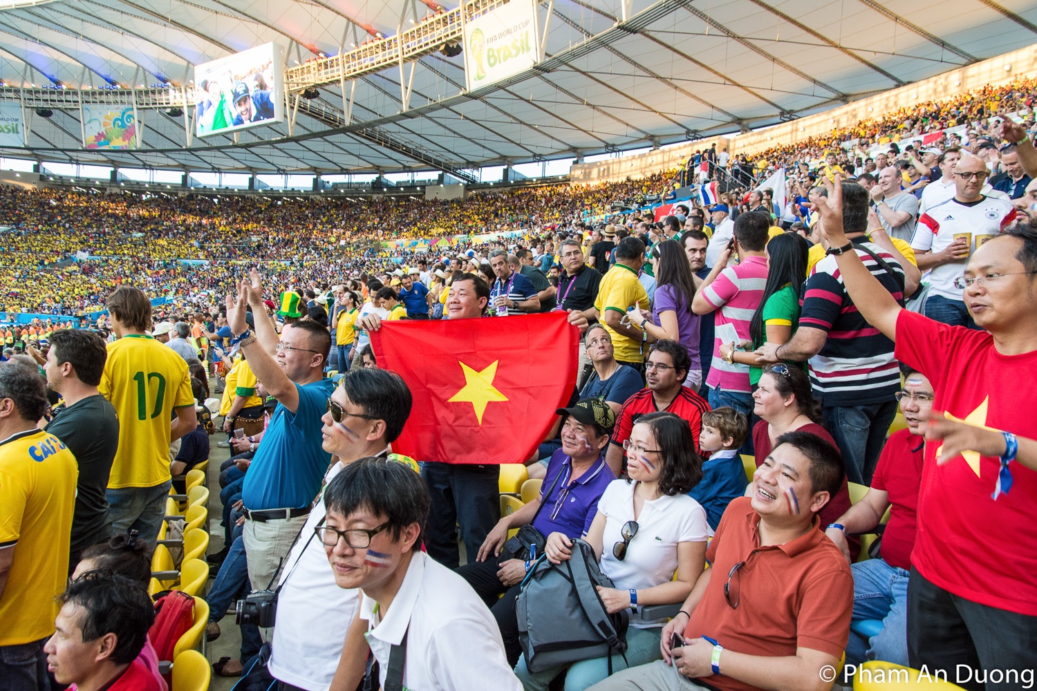 | Lá cờ Việt Nam rực rỡ trên sân vận động ở thành phố Rio de Janeiro. Anh Phạm An Dương chia sẻ: "Với những cổ động viên khắp năm châu, Việt Nam tuy rất xa xôi nhưng họ vẫn biết đến với nhiều tình cảm quý mến". |