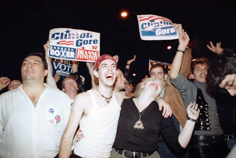 | Trong nhiệm kỳ giai đoạn 1993-2001, ông Bill Clinton là nhà lãnh đạo mở màn cho việc bổ nhiệm người đồng tính vào bộ máy chính phủ. Vào thập niên 60, Walter Jenkins, phụ tá cao cấp của cựu Tổng thống Lyndon B.Johnson, công khai là người đồng tính khiến sự nghiệp của ông bị huỷ hoại vì sự kỳ thị bởi những người xung quanh. Sau khi nhậm chức, ông Clinton đã bổ nhiệm khoảng 150 người đồng tính nam và nữ vào nội các Mỹ. Điều này gây ra nhiều ý kiến trái chiều và ông Clinton phải mất một thời gian để tìm kiếm sự ủng hộ về bình đẳng hôn nhân. Trong ảnh, người đồng tính ăn mừng chiến thắng của ứng viên tổng thống Bill Clinton tại West Hollywood năm 1992. Ảnh: AP |