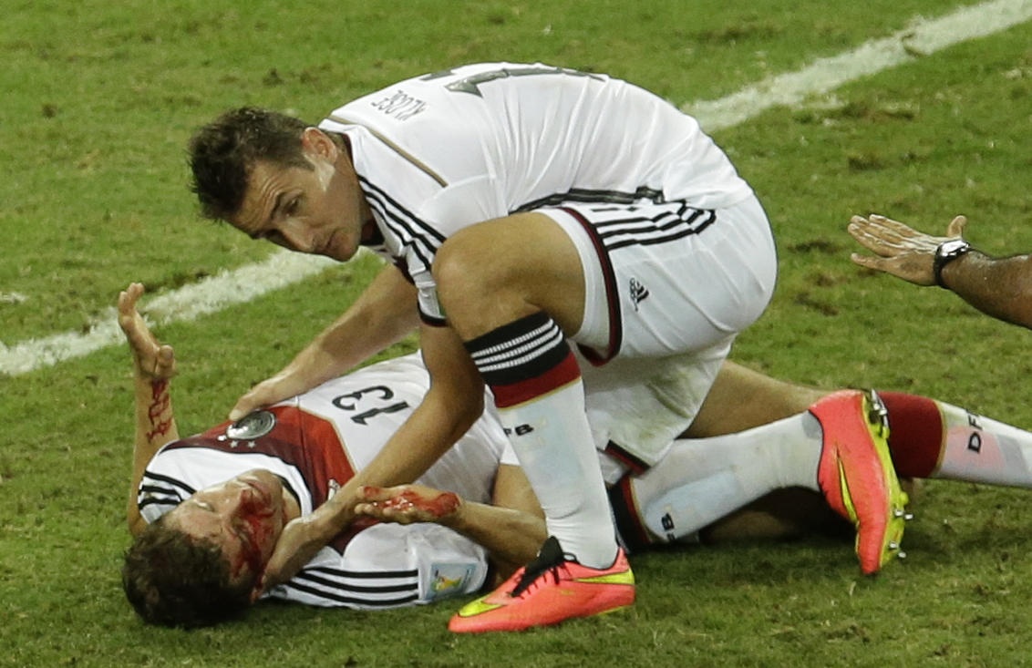 Gương mặt bê bết máu của Thomas Mueller trong pha tranh chấp với John Boye của Ghana. Kết cục, ngôi sao người Đức phải khâu tới 5 mũi ở phần gần mắt. |