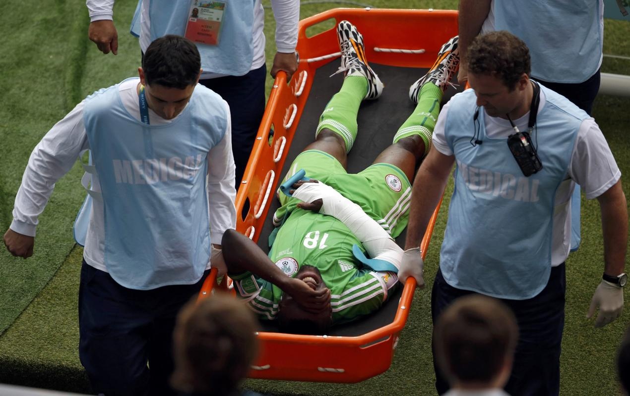 Cầu thủ người Nigeria - Michael Babatunde - được nhân viên dùng cáng đưa ra khỏi sân. Anh đau đớn vì bị gãy cổ tay sau một pha va chạm không chủ ý với người đồng đội trong trận gặp Argentina. |