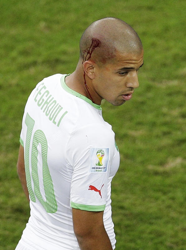 Máu chảy dài từ đầu xuống cổ ngôi sao mang áo số 10 Algeria - Sofiane Feghouli - sau khi anh dính cú đá của cầu thủ tuyển Nga. |
