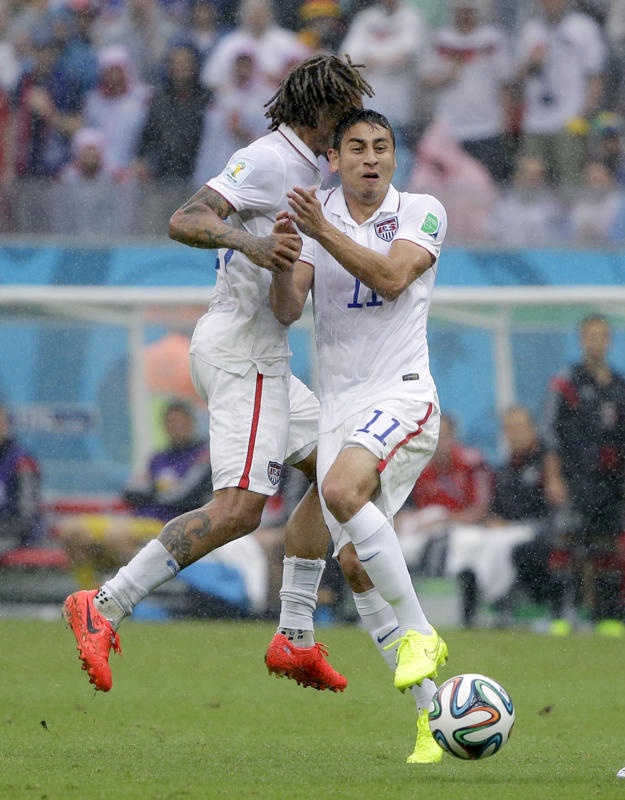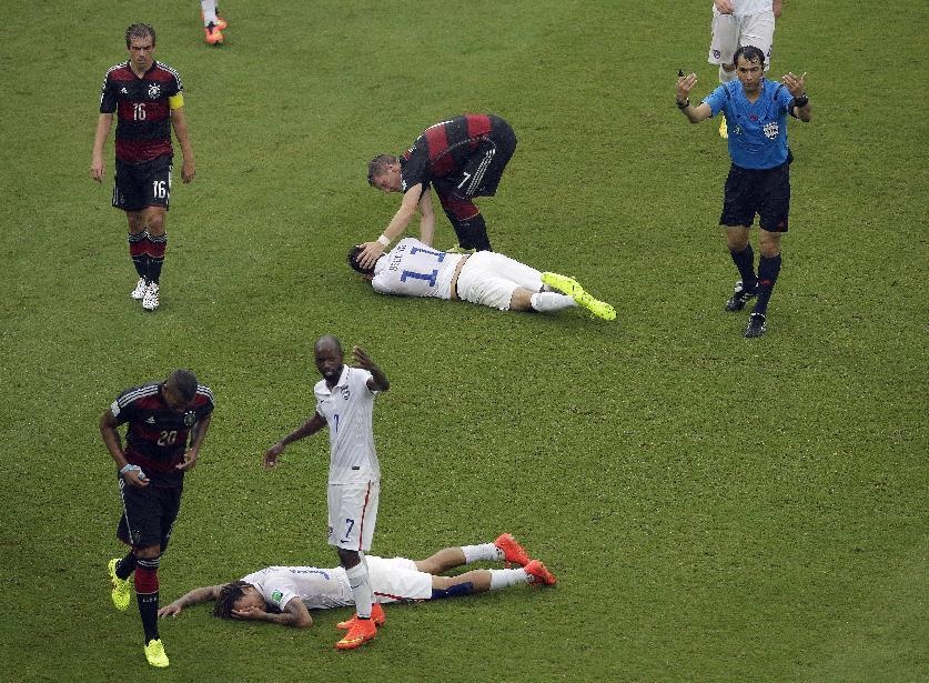 | Pha va đầu không chủ ý của hai cầu thủ đội tuyển Mỹ, Jermaine Jones và Alejandro Bedoya trong trận gặp Đức khiến cả hai bật ra xa, đau đớn gục ngã ngay trên sân. |