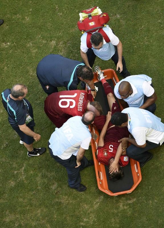 | Hậu vệ trái Fabio Coentrao chấn thương bắp trái trong trận gặp "cỗ xe tăng" Đức. Nếu như Bồ Đào Nha không phải về nước sớm thì Coentrao cũng phải chia tay World Cup vì chấn thương. |