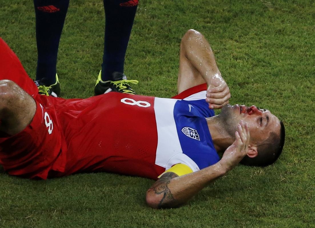 Sau khi lĩnh trọn cú đáp chân của cầu thủ người Ghana - Boye - Clint Dempsey ngã gục xuống sân với khuôn mặt đầy máu. Dù mũi bị dập và chảy rất nhiều máu nhưng ngôi sau tuyển Mỹ vẫn tiếp tục chơi cho tới cuối trận. |