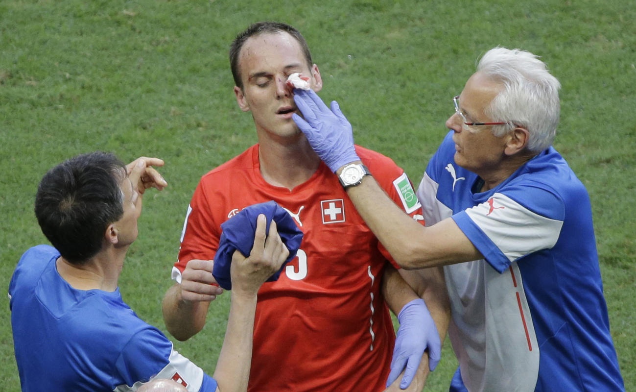 | Cầu thủ người Thụy Sỹ - Steve von Bergen - bị rách mắt và chảy rất nhiều máu sau pha va chạm kinh hoàng với tuyển thủ Pháp Oliver Giroud. |