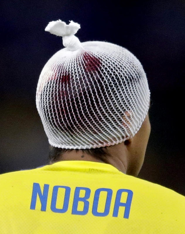 | Tuyển thủ Ecuador bê bết máu sau pha va chạm với Blaise Matuidi của Pháp. Anh phải tạm kìm máu bằng mũ lưới để tiếp tục thi đấu. |