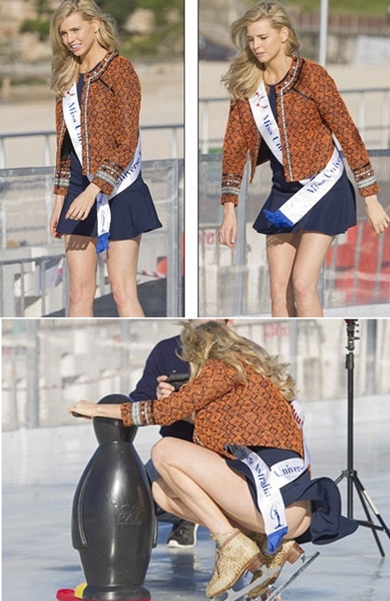 | Hoa hậu Úc Tegan Martin từng gặp sự cố hớ hênh khi mặc chiếc váy quá ngắn. Trong một lần xuất hiện tại bãi biển Bondi và tạo dáng chụp ảnh với chú chim cánh cụt đồ chơi, chiếc váy ngắn của người đẹp đã bị tốc lên trong một ngày gió lớn. |