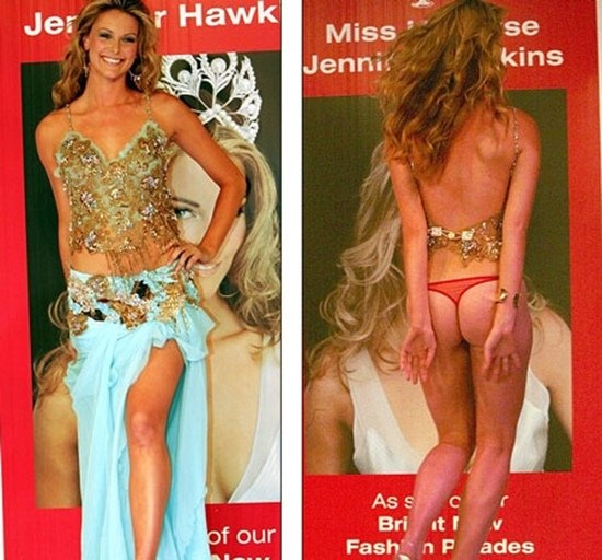 | Sự cố trang phục đình đám nhất phải kể đến việc giẫm phải chân váy, khiến cả chiếc váy bị tuột để lộ vòng ba trước đông đảo người xem của Hoa hậu hoàn vũ Jennifer Hawkins trong show biểu diễn tại Sydney, Úc vào năm 2004. Sự cố này được camera ghi lại và thậm chí được ví von là khoảnh khắc đáng xấu hổ nhất trên truyền hình Australia. |