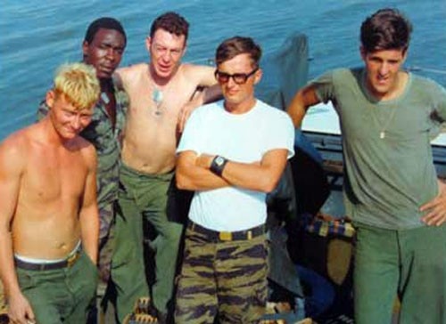 Đội tuần tra trên sông của Kerry. Từ trái qua phải là Gene Thorson, David Alston, Thomas Belodeau, Del Sandusky và Kerry. Trong video trước chuyến công du chính thức Việt Nam trên cương vị ngoại trưởng Mỹ, ông Kerry chia sẻ: “Tôi có thể nhắm mắt và nhớ lại đất nước mà tôi đã thấy trong thời gian chiến tranh - hình ảnh những con trâu, dòng sông hẹp ngoài sức tưởng tượng, cây đước, ngư dân và những con thuyền gỗ của họ”. Ảnh: Boston.com
