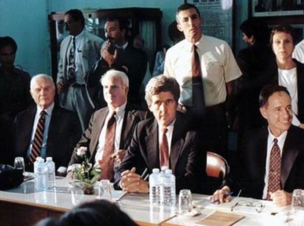 Năm 1991, John Kerry tới Việt Nam với tư cách cá nhân khi đang đảm trách cương vị thượng nghị sĩ Mỹ. Đây là lần đầu tiên ông Kerry trở lại Việt Nam kể từ năm 1969. Lúc đó, Kerry đang làm Chủ tịch Ủy ban Thượng viện về các vấn đề tù binh và quân nhân Mỹ mất tích trong chiến tranh. Ảnh: Politico