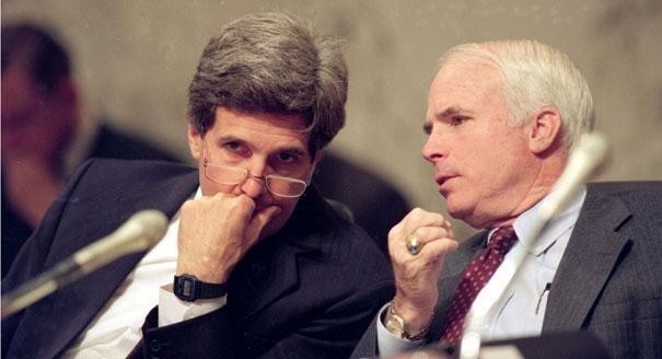 Năm 1994, ông Kerry tới Việt Nam trên cương vị thượng nghị sĩ Mỹ, BBC cho biết. Là người từng tham chiến ở Việt Nam, ông ủng hộ mạnh mẽ Thượng viện Mỹ thông qua nghị quyết kêu gọi dỡ bỏ cấm vận đối với Việt Nam. Một năm sau, Tổng thống Bill Clinton chính thức tuyên bố bình thường hóa quan hệ ngoại giao với Việt Nam. Bức ảnh chụp ông John Kerry (thứ 3 từ trái) và Thượng nghị sĩ John McCain (thứ 2 từ trái) tại Hà Nội năm 1995. Ảnh: AP