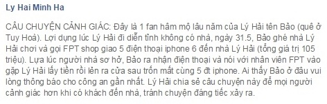 Lựa lúc người nhà sơ hở, Bảo ra nhận điện thoại và nói với nhân viên FPT vào gặp Lý Hải lấy tiền rồi lẻn ra cửa sau trốn mất cùng năm điện thoại iPhone”.