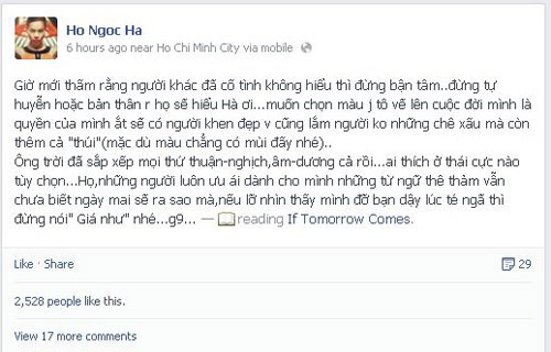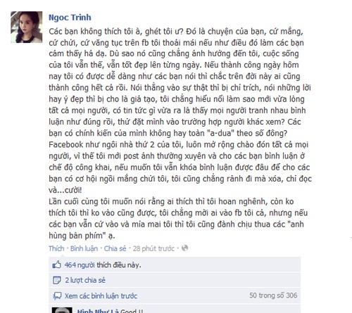 Mạng xã hội như ngôi nhà thứ 2 của tôi, luôn mở rộng chào đón tất cả mọi người, vì thế, tôi mới post ảnh thường xuyên và cho các bạn bình luận ở chế độ công khai. Nếu muốn tôi vẫn khóa bình luận được đâu để cho các bạn có cơ hội ngồi mắng chửi tôi, tôi cũng chẳng rảnh đi mà xóa, chỉ đọc và... cười! Lần cuối cùng tôi muốn nói rằng, ai thích tôi hoan nghênh, còn không thích tôi khôngo vào cũng được, tôi chẳng mời ai vào trang của tôi cả, nhưng nếu các bạn vẫn cứ vào và mỉa mai, tôi cũng đành chịu thua các “anh hùng bàn phím” ạ”.