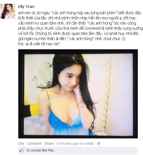 “Anh em ơi, từ ngày 'các anh hùng núp sau lưng bàn phím' biết được đây là trang thật của Elly, nhà mình nhộn nhịp hẳn lên mọi người ạ. Tốt hay xấu mình không quan tâm nhé, chỉ cần thấy 'các anh hùng' lúc nào cũng phải chầu chực trước cửa nhà mình để comment là mình thấy sung suớng vô bờ. Chứng tỏ mình được quan tâm lắm. Cứ phát huy nhé. Elly gửi ngàn nụ hôn thân ái đến 'các anh hùng' nhé. Chụt chụt”.