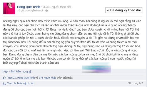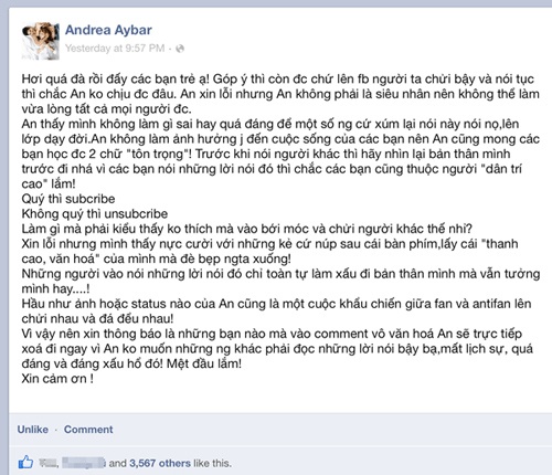 Các bạn được quyền chửi mắng hay nói tôi thế này thế kia là tùy ở các bạn, nhưng xin đừng đụng chạm đến ba mẹ tôi. Gia đình tôi không phải để cho các bạn được phép ăn nói một cách vô văn hóa. Mọi chuyện là do tôi gây ra, đừng chạm đến ba mẹ tôi, trang cá nhân này cũng để là nơi những người yêu quý và theo dõi tôi được và cùng tôi chia sẻ mọi chuyện, không phải giành cho những bạn không ưa tôi. Vậy đừng vào và dùng những từ vô văn hóa đó. Các bạn đã tốt chưa mà lên án người khác?