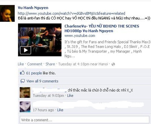 Vũ Hạnh Nguyên nổi tiếng bằng những phát ngôn về hàng hiệu và sẵn sàng "phản pháo" bất cứ ai. Vì vậy, lượng anti-fan của cô cũng kha khá. Cách đây không lâu khi “yêu nữ hàng hiệu” tung clip Yêu nữ Behind The Scenes như một lời cảm ơn gửi đến tất cả fan và ê-kíp riêng. Clip này được đăng tải trên trang cá nhân của cô và ngay lập tức bị “ném đá”. Đa phần comment trên Youtube đều chỉ trích cô “chơi trội”, không tôn trọng khán giả với hành động chỉ tay thẳng vào ống kính của rapper Mr.T. Tức giận, Vũ Hạnh Nguyên đã xóa tất cả comment chửi bới, chỉ giữ lại những ý kiến khen, tiếp đó là sự xuất hiện của status giật gân này.
