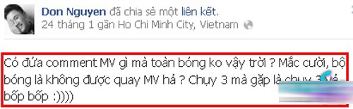 Don Nguyễn đã bày tỏ cảm xúc trên trang cá nhân khi có người xem MV và để lại comment lời chê bai. Anh hài hước viết: “Có đứa comment MV gì toàn bóng không vậy trời? Mắc cười, bộ bóng là không được quay MV hả? Chụy 3 mà gặp chụy 3 vả bốp bốp”.
