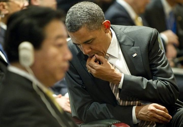 | Tổng thống Obama lấy miếng bã kẹo cao su ra khỏi miệng trong lúc ông đang dự hội nghị thượng đỉnh Đông Á tại Indonesia vào ngày 19/11/2011. Theo Daily Mail, ngay cả khi ông tham dự một phiên họp căng thẳng với các lãnh đạo châu Âu tại hội nghị G20 ở Pháp trong cùng năm, Tổng thống Mỹ vẫn nhai kẹo cao su "trong ít nhất 15 phút". Tổng thống Obama đã tập cai nghiện thuốc lá từ năm 2006. Ảnh: AFP |