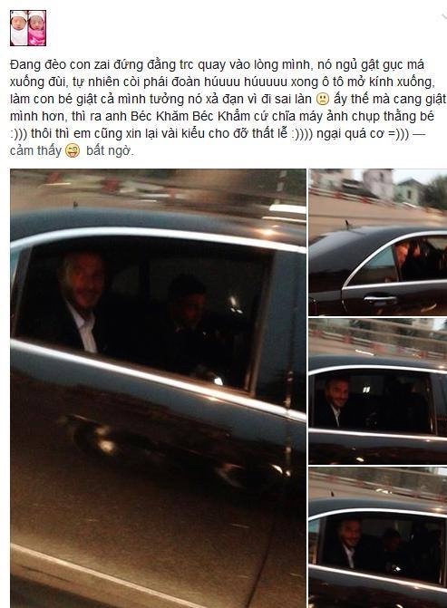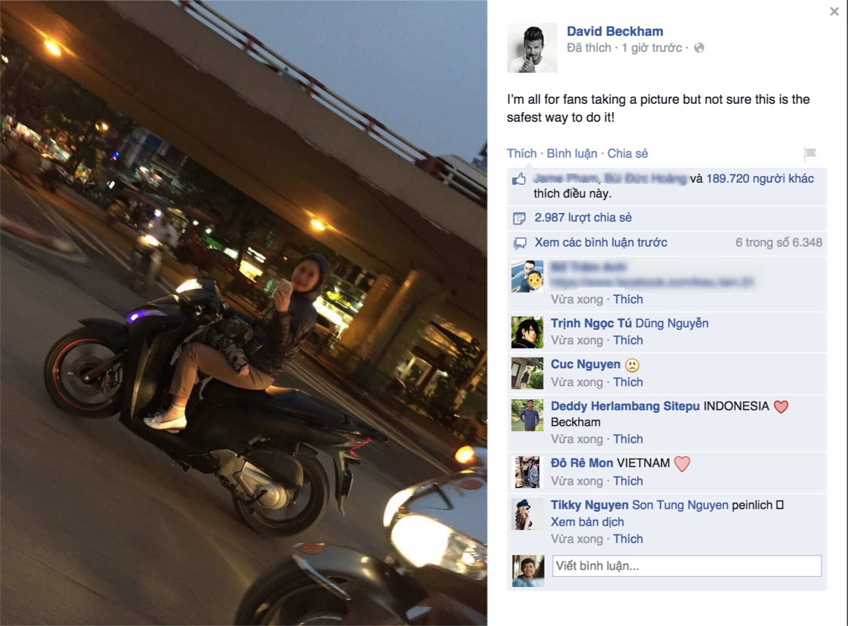 Khoảng 22h tối 12/11, theo giờ Việt Nam, trang fanpage chính thức của David Beckham đã đăng bức ảnh một người phụ nữ chở theo em bé nhỏ ngồi ngay phía dưới sàn xe máy. Người phụ nữ này thậm chí còn vừa điều khiển xe máy vừa giơ điện thoại chụp ảnh đoàn xe đón Beckham trong khi không đội mũ bảo hiểm. Cựu thủ quân ĐT Anh đã tỏ ra lo lắng khi đăng ảnh kèm lời tựa: "Tôi luôn sẵn sàng cho NHM chụp ảnh mình nhưng tôi nghĩ chụp ảnh như thế này thì không an toàn".