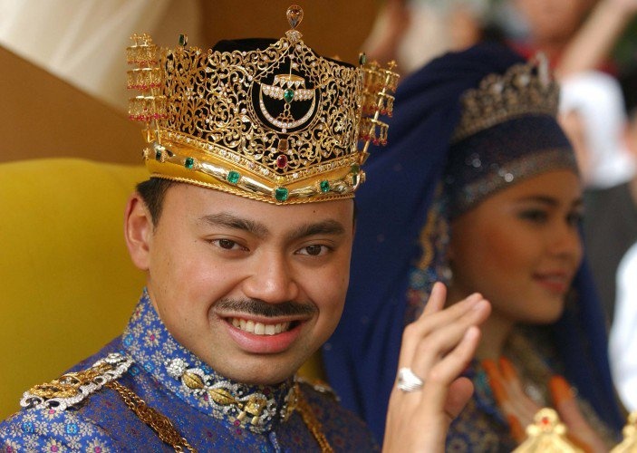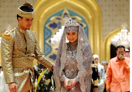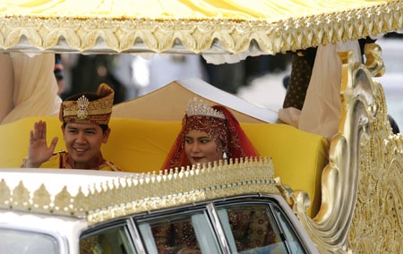 | Lễ cưới diễn ra vào tháng 9/2004 tại cung điện Istana Nurul Iman trước sự chứng kiến của hơn 2.000 quan khách, trong đó gồm thành viên hoàng gia của nhiều nước như Nhật Bản, Jordan, Anh và Malaysia. Hoàng gia Brunei sử dụng 103 chiếc Limousine để rước dâu. Theo Telegraph, toàn bộ phục sức của cô dâu và chú rể đều được làm bằng vàng nguyên chất và gắn kim cương. Tổng chi phí của sự kiện này lên đến 5,7 triệu USD. Ảnh: Reuters |