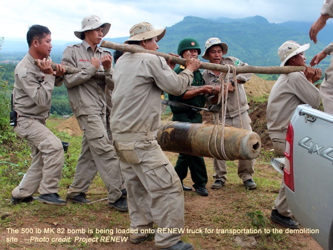 Các nhân viên kỹ thuật thuộc Dự án Phục hồi môi trường và Khắc phục hậu quả chiến tranh (Dự án RENEW) di chuyển một quả bom Mk82 chưa nổ ở huyện Hướng Hóa, Quảng Trị. Rất nhiều quả bom thuộc series Mk80 và vật liệu nổ khác rơi xuống mặt đất nhưng chưa phát nổ. Chúng đặc biệt trở nên nguy hiểm khi người dân tự ý khai thác và bán cho các cơ sở thu mua phế liệu để lấy thuốc nổ. Ảnh: Dự án RENEW