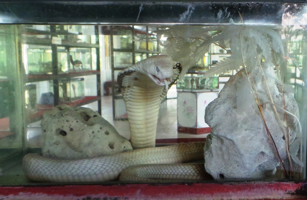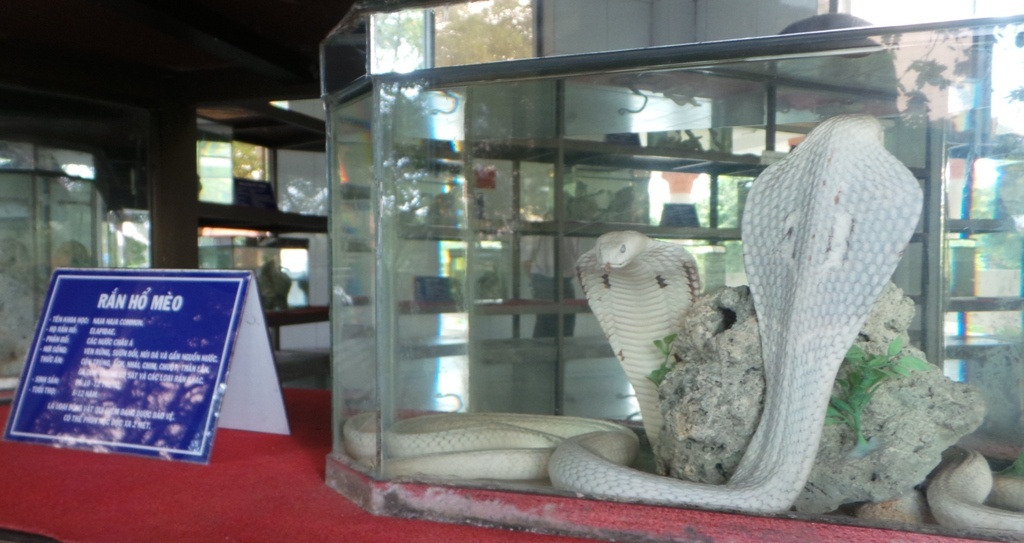 Hổ mang chúa, hổ mèo, cạp nia, đẻn biển hay rắn lục đuôi đỏ đang được nuôi dưỡng và trưng bày tại trại rắn Đồng Tâm (tỉnh Tiền Giang).