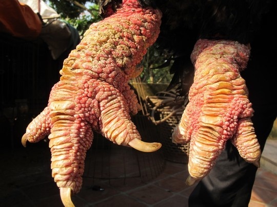 Gà Đông Tảo không giống bất cứ giống gà nào trong cả nước cả về hình dáng, đặc biệt đôi chân to rất “khủng” của gà trống mà thực khách hay gọi là “chân rồng”. Tuy nhiên, để sở hữu những con gà to, dáng đẹp, khách có khi phải bỏ ra cả cây vàng SJC mới mua được. Ảnh: Người Lao Động. |