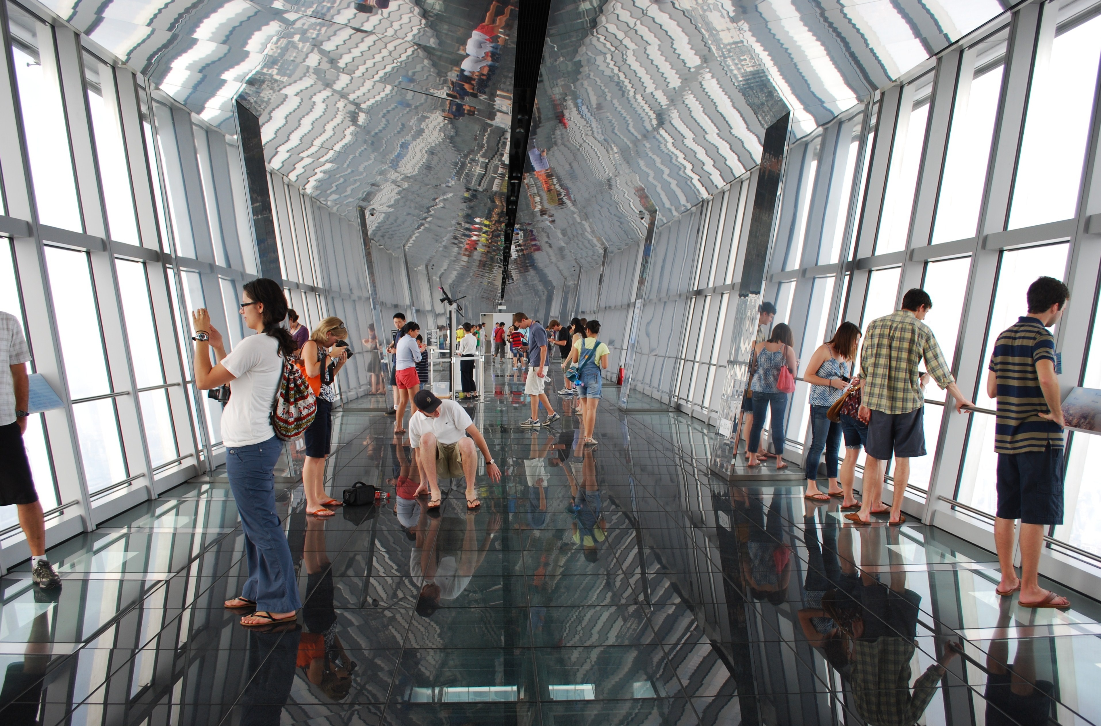 Shanghai World Financial Center, Thượng Hải Tòa tháp hình mở nắp chai nổi tiếng này cũng sở hữu một trong những đài quan sát cao nhất thế giới. Tại tầng thứ 100, Skywalk cũng được mở ra giúp du khách có thể đi bộ ngắm nhìn thành phố Thượng Hải tuyệt đẹp ngay dưới chân từ trên độ cao 474m so với mặt đất. |
