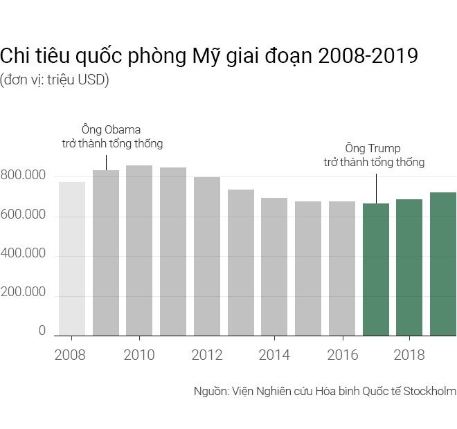 Sau khi ông Trump đắc cử, chi tiêu quốc phòng Mỹ thực sự đã tăng đều đặn, mặc dù mức tổng thể vẫn thấp hơn những năm đầu tiên của chính quyền ông Obama.