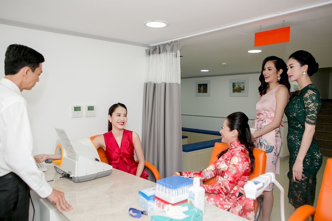 Người đẹp Nam Em, Diệu Linh, Hà Thu tham quan phòng khám khang trang và sử dụng thử các trang thiết bị hiện đại của Monaco Healthcare. |