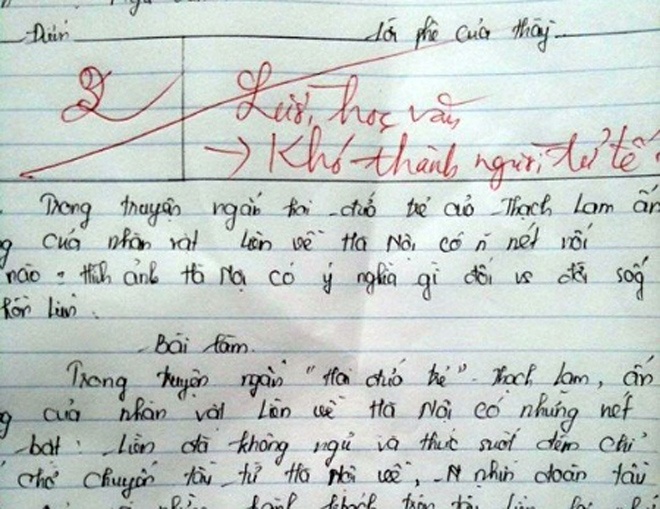 Những lời phê này nhận được rất nhiều ý kiến trái chiều của cộng đồng mạng. Người đồng tình bởi sự độc đáo, người phản đối vì cho rằng không phù hợp với môi trường sư phạm. Trong ảnh: bài kiểm tra Văn bị điểm kém của một học sinh kèm theo lời phê khá nặng nề "Lười học văn, khó thành người tử tế".