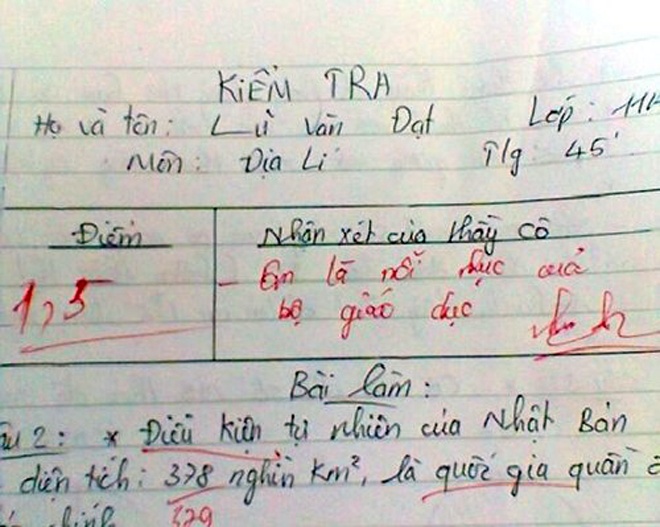 | Bài kiểm tra môn Địa lý với lời phê "Em là nỗi nhục của bộ giáo dục", khiến nhiều thành viên phản đối vì nhận xét xúc phạm học sinh này. |