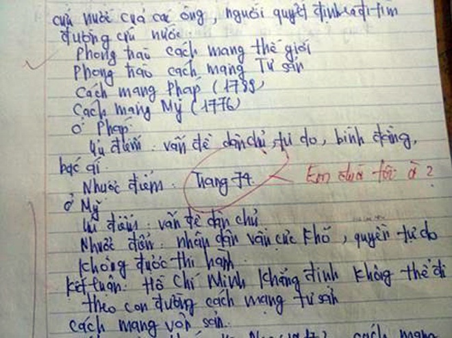 Đây là bài kiểm tra của trường Học viện Tài chính (Hà Nội). Không biết vì vô tình hay cố ý mà sinh viên đã ghi phần nhược điểm của Cách mạng tư sản Pháp (1789) là số trang sách giáo khoa để giáo viên tự dò. Đáp lại, giáo viên cũng có phần nhận xét hài hước "Em đùa tôi à" để nhắc nhở sinh viên này.