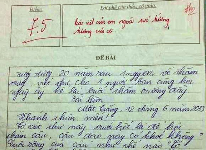 Gần đây, bài kiểm tra của Vũ Trường An - học sinh lớp 9 trường THCS Trần Phú (Hải Phòng) không chỉ gây chú ý bởi nội dung "chém gió" độc đáo, mà chính lời phê của giáo viên "bài viết của em ngoài sức tưởng tượng của cô", cũng khiến nhiều người rất thích thú.