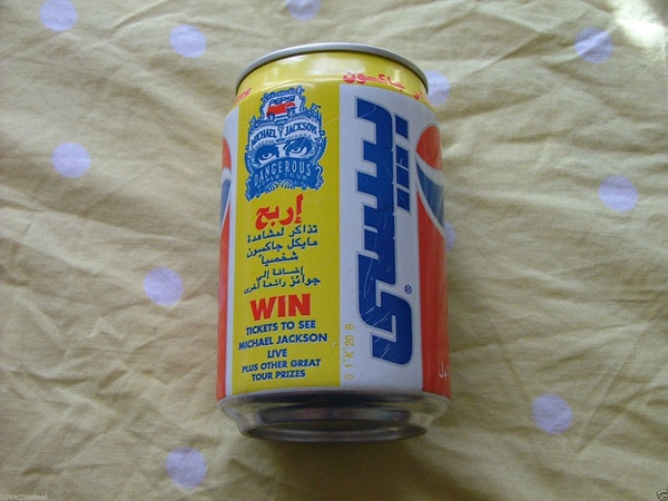 4. Lon Pepsi còn nguyên chưa mở trong Tour lưu diễn "Dangerous" năm 1993 của Michael Jackson - 5.000 USD Lọai lon này là rất hiếm vì nó được sản xuất ở UAE (Các tiểu vương quốc Ả-rập thống nhất) và được thu hồi lại sau một tuần vì tour diễn bị hủy bỏ. |
