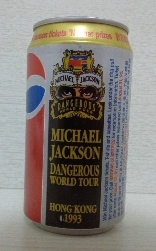 7. Lon Pesi sản xuất năm 1993 tại Đài Loan trong Tour lưu diễn "Dangerous" của Michael Jackson -2.500 USD Ai mua lon nước ngọt này sẽ được khuyến mại thêm chiếc vé của buổi biểu diễn. |