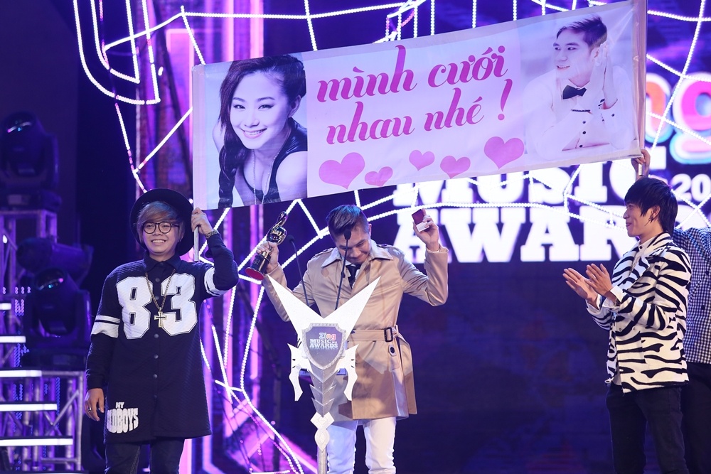 | Khi lên sân khấu nhận giải, tác giả Mùa đông vắng em bất ngờ quỳ gối cầu hôn Lương Bích Hữu với sự trợ giúp của nhóm Tam Hổ cầm băng rôn ở phía sau. Khánh Đơn chia sẻ: "Anh cảm ơn tình yêu của em rất nhiều, nó thay đổi con người anh”. |