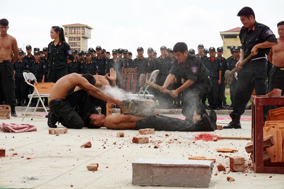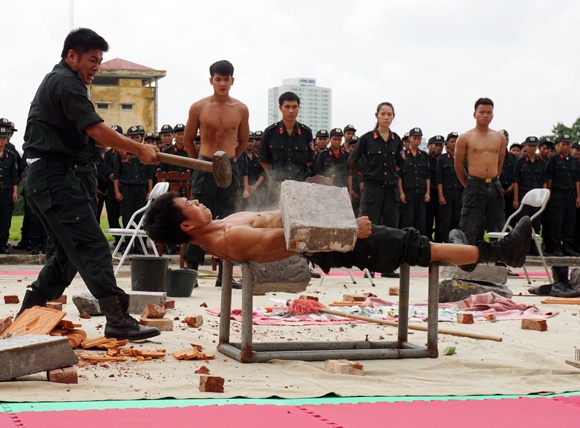 | Vào những ngày này, thao trường trên sân Bộ tư lệnh CSCĐ nắng gắt, song những tốp võ thuật vẫn miệt mài rèn luyện, để hoàn thiện hơn nữa về thể chất, kỹ- chiến thuật... nhằm tăng cường khả năng chiến đấu cao trong mọi tình huống, nhiệm vụ. Trong ảnh: Pha công lực bằng búa tạ phá chồng gạch trên lưng, dưới cổ cắm giáo. |