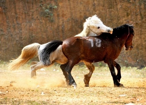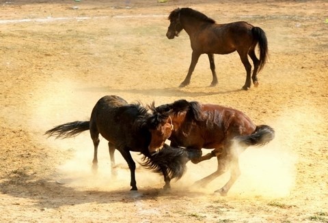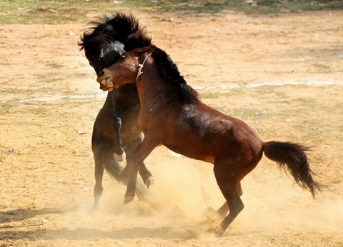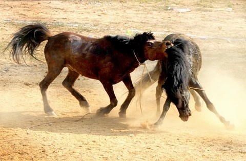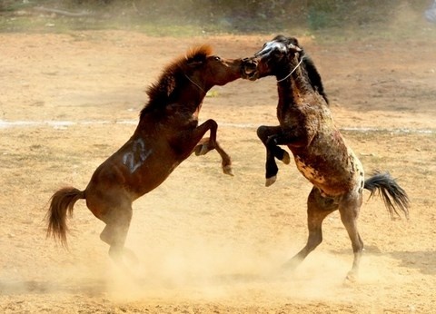 | Sân đấu được qui định trong vạch tròn. Một con ngựa cái đẹp được đưa vào để hai đấu sĩ ngựa tranh nhau, chú nào bị đẩy ra ngoài vạch vôi hai lần sẽ bị xử thua. |