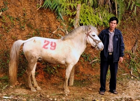| Ông Vá với chú ngựa từ huyện Thông Nguyên cách xa hơn 100 km cũng về tham gia hội đấu. |