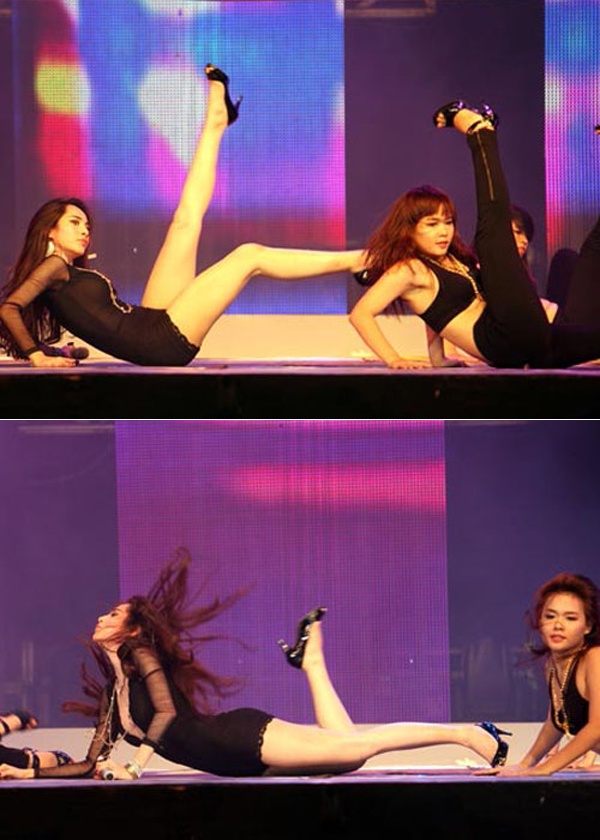 | Trong một chương trình ca nhạc ở Sài Gòn, nữ ca sĩ chuyển giới có màn nhảy dạng chân trên sàn khá táo bạo. |