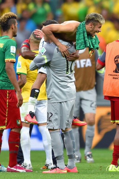 Ngôi sao Brazil Neymar phấn khích cởi áo và nhảy lên ăn mừng như một đứa trẻ sau chiến thắng 4-1 trước Cameroon trên sân Estadio Nacional. |