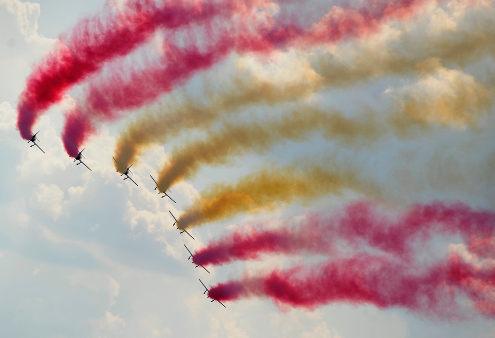 | Đội bay Patrulla Aguila của Không quân Tây Ban Nha thả khói màu quốc kỳ của nước này trong buổi bay trình diễn ở căn cứ không quân Silac, triển lãm hàng không quốc tế Slovak, ngày 31/8. |