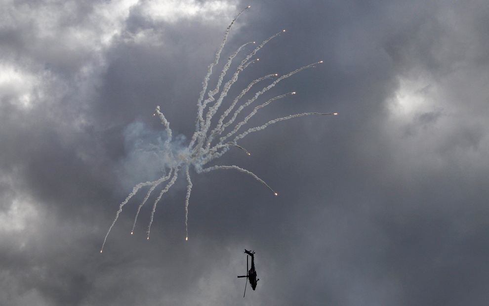 | Màn bay tập thể phóng mồi bẫy nhiệt của đội bay "Những con chim ưng Nga". Trong chiến đấu, những mồi bẫy nhiệt này sẽ đánh lửa các tên lửa dùng đầu tự dẫn hồng ngoại. Còn trong các buổi bay triển lãm, việc phóng mồi bẫy nhiệt tạo ra hiệu ứng thị giác rất ấn tượng. |