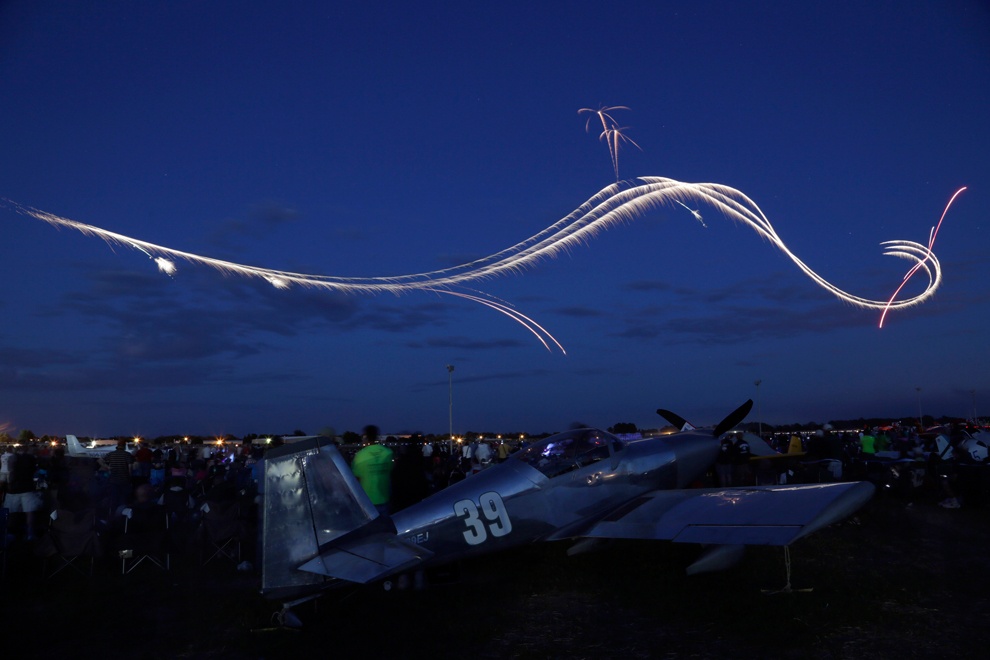 | Một chiếc máy bay không rõ chủng loại để lại đường sáng dài trong buổi chiều tà ở triển lãm hàng không EAA AirVenture, tổ chức hồi đầu tháng 8/2013. Khác với màn phóng mồi bẫy nhiệt, đường sáng này được tạo ra chỉ bằng ánh đèn của máy bay và hiệu ứng phơi sáng của máy ảnh. |