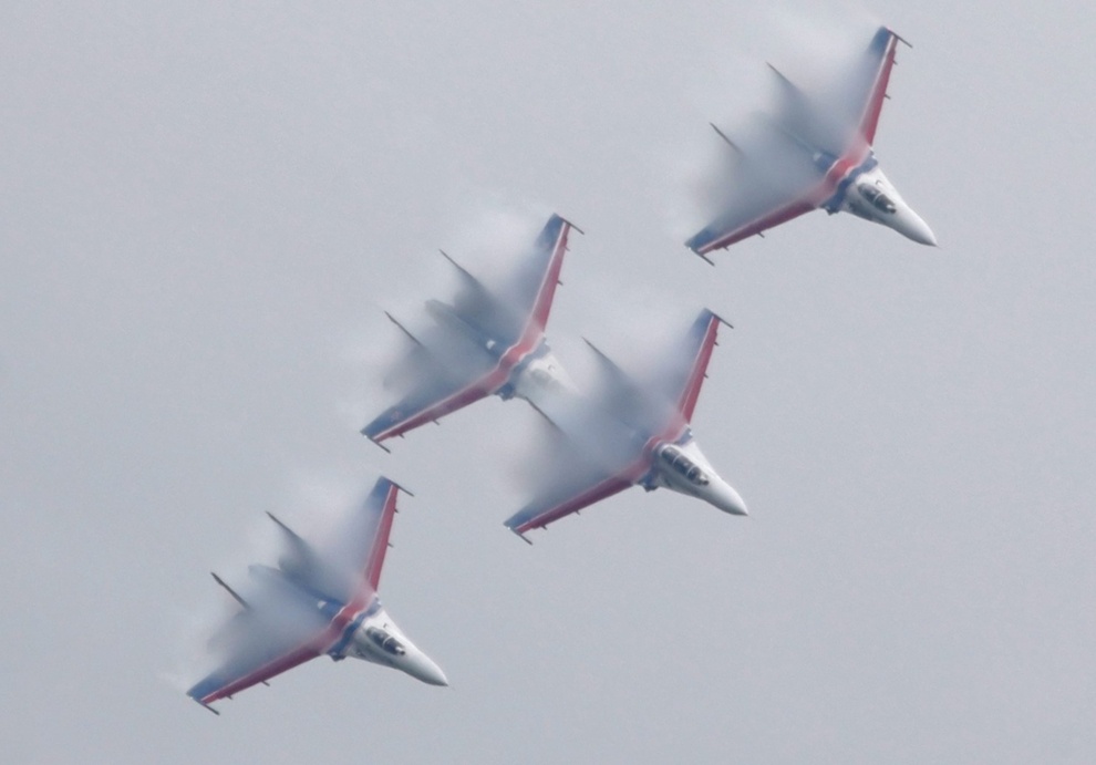 | Máy bay Su-30 của đội bay "Những hiệp sĩ Nga" biểu diễn màn đồng diễn trên không ở tốc độ siêu âm tại triển lãm MAKS-2013. |
